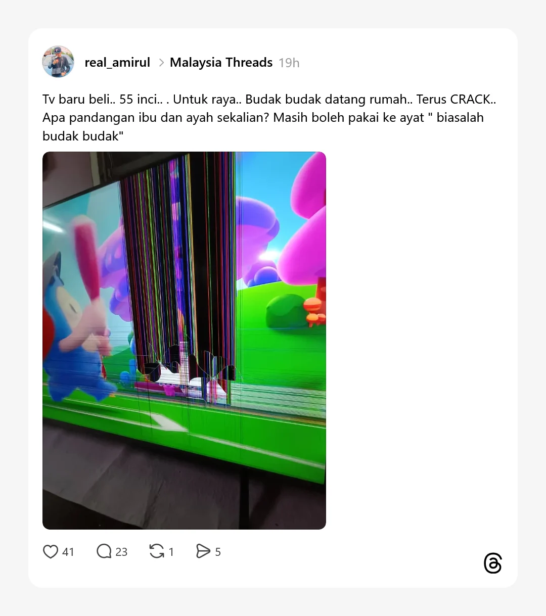 Menjelang musim perayaan, ramai yang membuat persiapan rapi termasuk membeli kelengkapan baharu untuk menceriakan suasana rumah. Namun, satu perkongsian di Thread baru-baru ini mengundang perbincangan hangat apabila sebuah televisyen bersaiz 55 inci yang baru dibeli dilaporkan retak selepas dikunjungi tetamu yang membawa anak kecil.