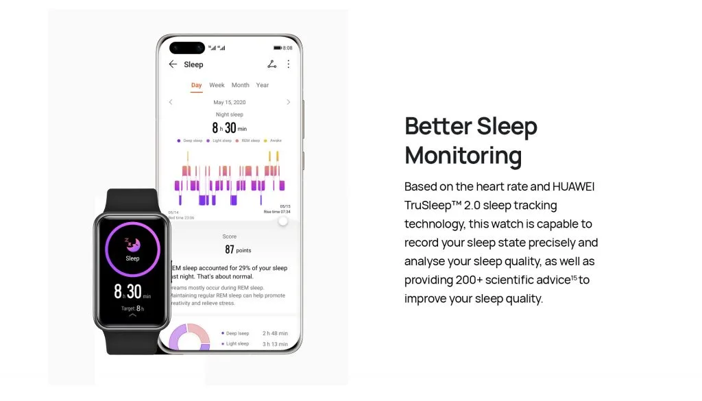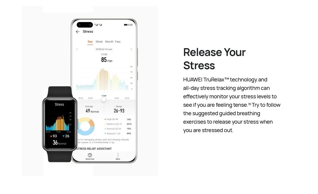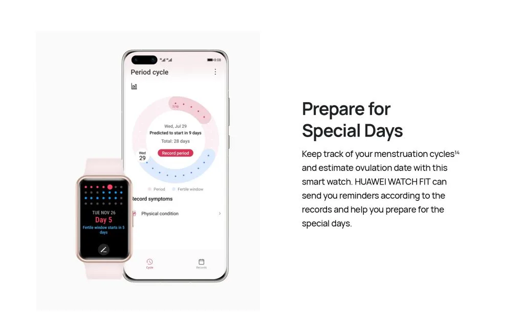 Satu lagi ciri yang disertakan oleh HUAWEI dalam Watch Fit adalah kemampuannya untuk memantau kitaran tidur dan kitaran haid. Terdapat juga sokongan untuk melakukan latihan menghilangkan tekanan, menampilkan semua notifikasi dari telefon pintar, mengendalikan muzik dan juga dapat digunakan sebagai remote shutter.