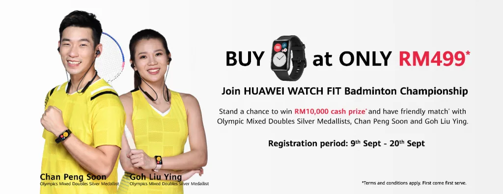 Bagi setiap pembelian HUAWEI Watch Fit, anda berpeluang memenangi RM10,000 dengan menyertai peraduan HUAWEI WATCH FIT Badminton Championship yang bermula dari 9 hingga 20 September 2020.