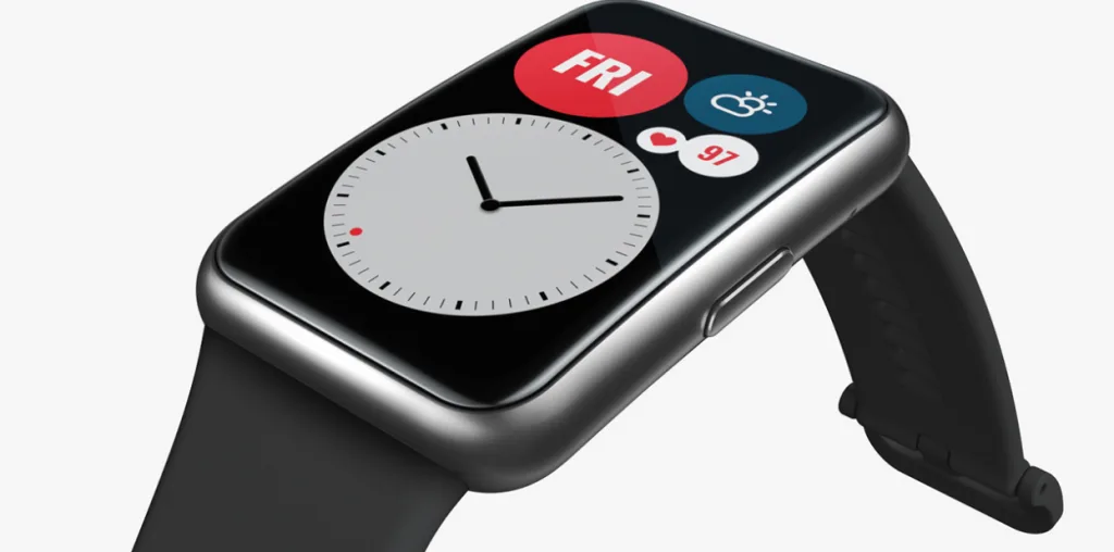 HUAWEI Watch Fit ini mempunyai paparan AMOLED berukuran 1.64 inci dengan resolusi 456 x 280 piksel, dan tepi layar sedikit melengkung di semua sisi. Jam tangan pintar ini terbuat dari “fiber polimer” yang dikatakan mempunyai daya tahan yang kuat.