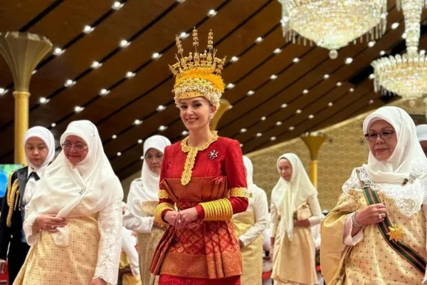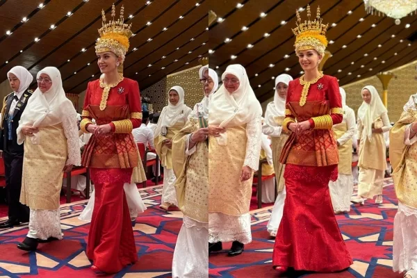 Memeriahkan lagi majlis istiadat ini, Dayang Anisha berjaya mencuri perhatian ramai apabila tampil menggayakan persalinan baju songket tradisional berona merah dengan hint emas.