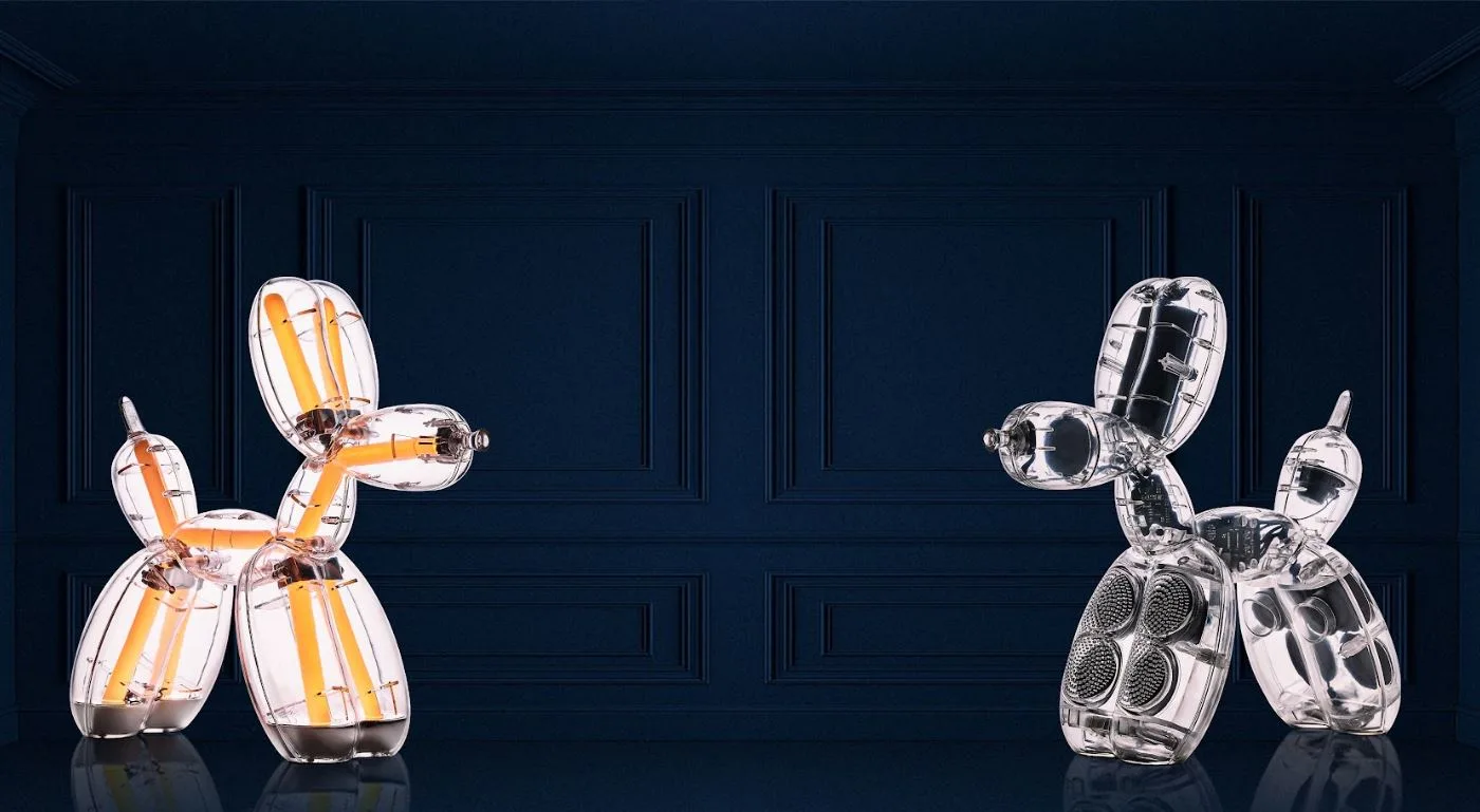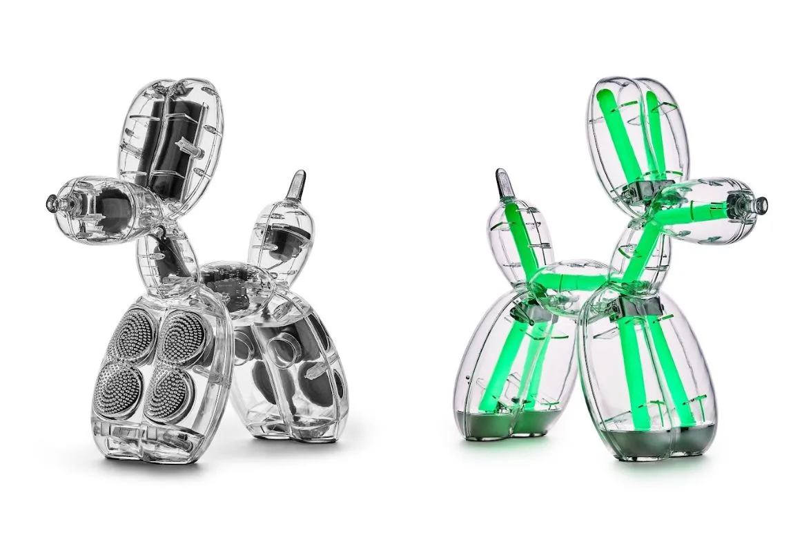 Balloon Dog Speaker mengekalkan bentuk ikonik Jeff Koons tetapi diolah semula dalam bahan lut sinar yang menonjolkan lengkungan dan pantulannya.