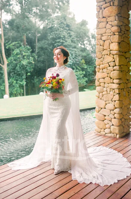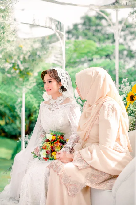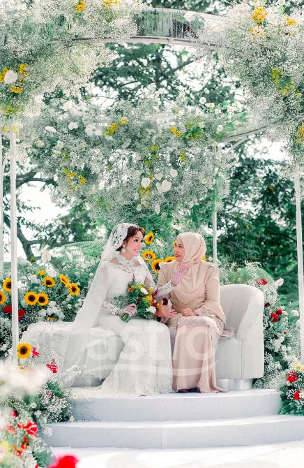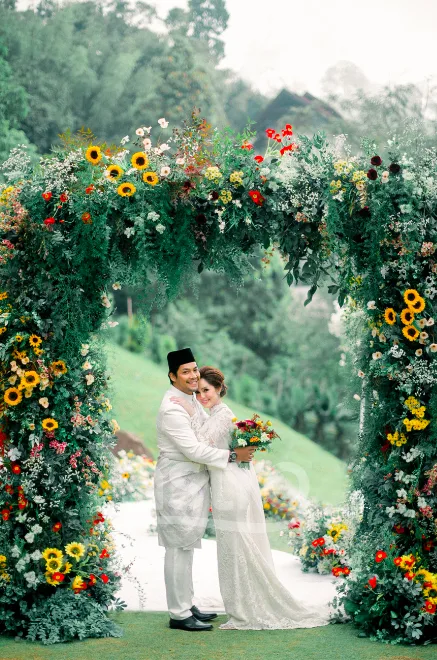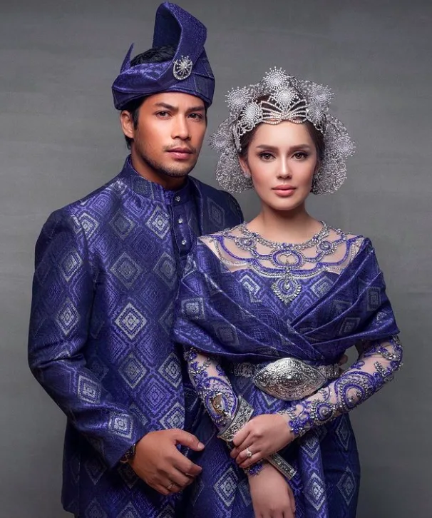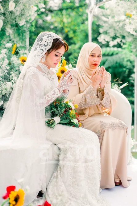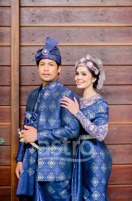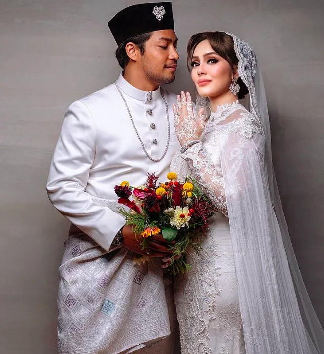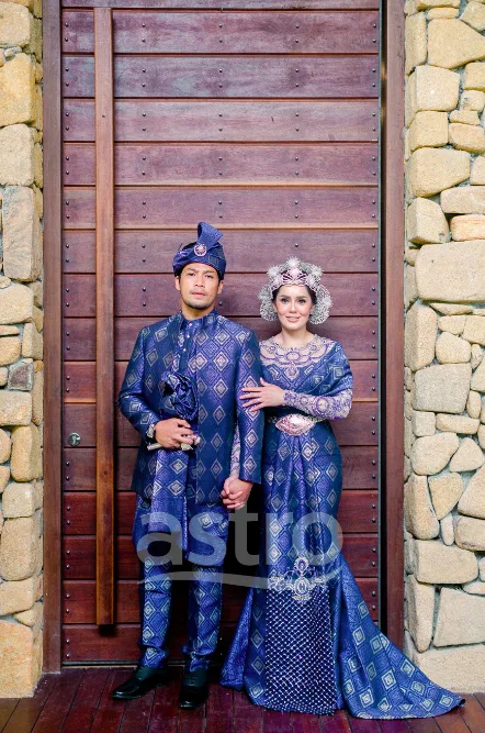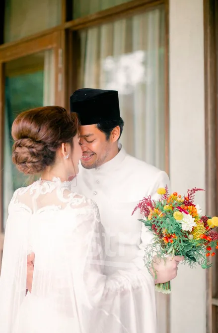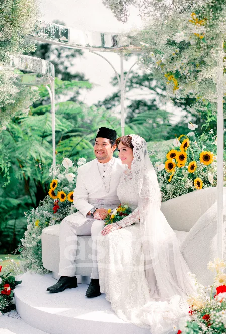 Sama cantik dan sama padan, pasangan pengantin ini kelihatan cukup cantik dan segak bergaya mengenakan persalinan nikah daripada pereka Shanell Harun sebelum disusuli dengan persalinan tradisional daripada kain songket berona ungu hasil rekaan Rizman Ruzaini.