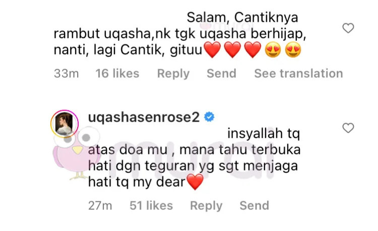 Uqasha dilihat membalas komen netizen berkenaan dengan menitipkan ucapan terima kasih di atas doa dan teguran yang sangat menjaga hatinya.