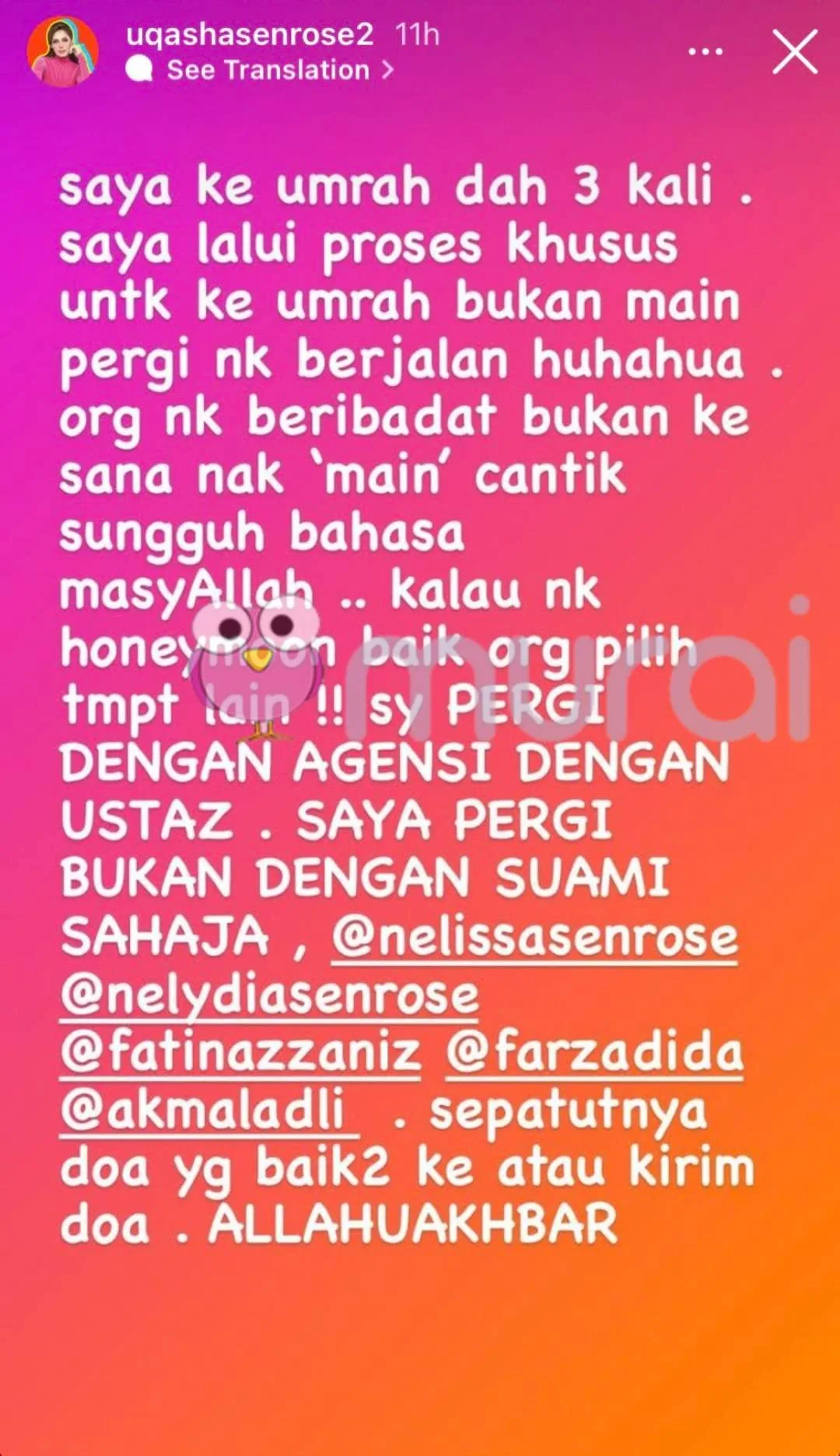 “Kalau nak honeymoon baik orang pilih tempat lain!! Saya PERGI DENGAN AGENSI DENGAN USTAZ. SAYA PERGI BUKAN DENGAN SUAMI SAHAJA, @nelissasenrose @nelydiasenrose @fatinazzaniz @farzadida @kamaladli.”-Uqasha Senrose