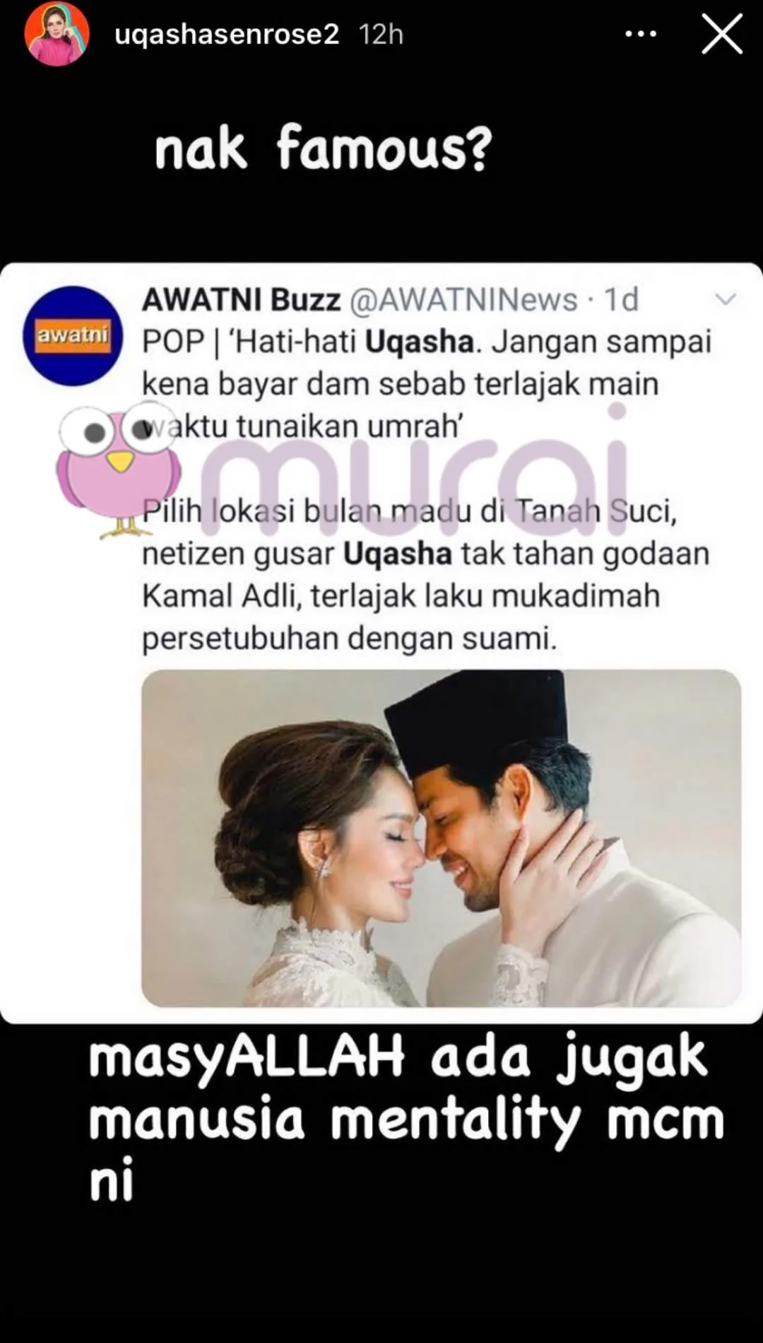 Menerusi posting di Insta Stories, Uqasha memuatnaik screenshot dari tweet yang dikenali sebagai AWATNI Buzz yang memintanya hati-hati dan jangan sehingga terpaksa bayar dam kerana ‘terlajak main’ sewaktu menunaikan umrah. Uqasha Senrose meluahkan rasa terkejut apabila masih terdapat manusia yang berfikiran sebegitu.