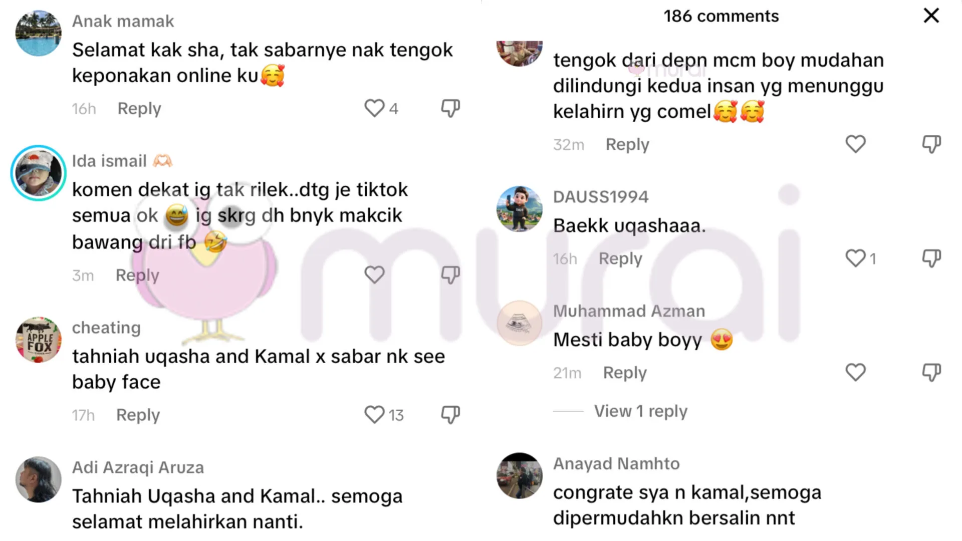 Menjengah ke ruangan komen, rata-rata netizen menitipkan doa buat Uqasha dan bayi yang berada di dalam kandungan, serta ada yang sempat berteka-teki mengenai jantina bayi yang akan dilahirkan oleh Uqasha kelak.