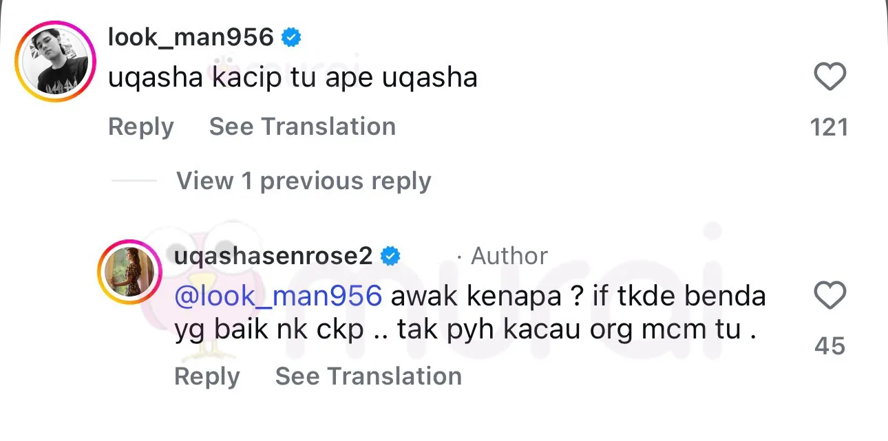 “Awak kenapa? Kalau takde benda yang baik nak cakap. Tak payah kacau orang macam tu.”-balas Uqasha Senrose di Instagram