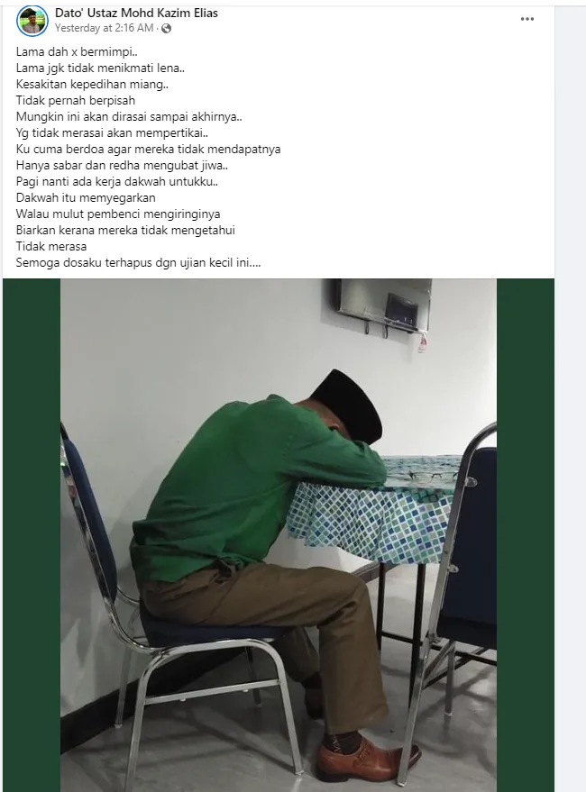 Terkini di Facebook, pendakwah terkenal ini dilihat memuatnaik foto dirinya yang tertidur di meja dan menyatakan bahawa dirinya sudah lama tidak dapat menikmati tidur yang lena kerana penyakit misterinya itu.