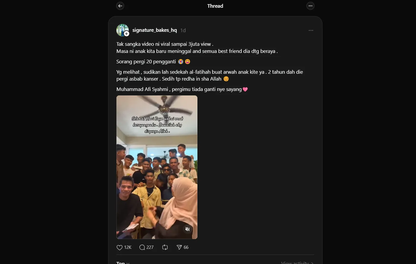 Dalam satu perkongsian di akaun Threads @signature_bakes_hq, wanita ini mengimbau kembali rasa syukur dan sebak apabila sekumpulan rakan anak lelakinya datang melawat mereka sekeluarga sewaktu musim perayaan 2 tahun yang lalu Kedatangan itu benar-benar memberi kejutan yang cukup besar dan menyentuh hati, memandangkan anak lelakinya telah pergi buat selamanya.