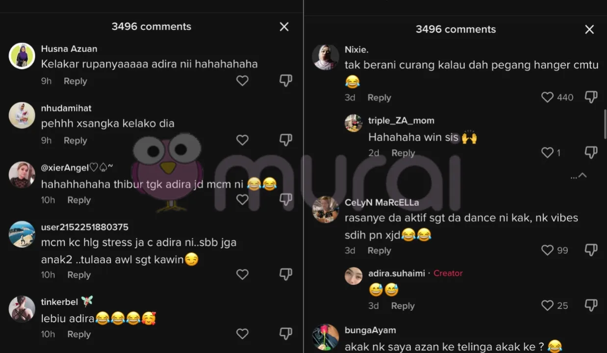 Rata-rata komen dari peminatnya itu, tak menyangka bahawa Adira merupakan seorang yang begitu mencuit hati.