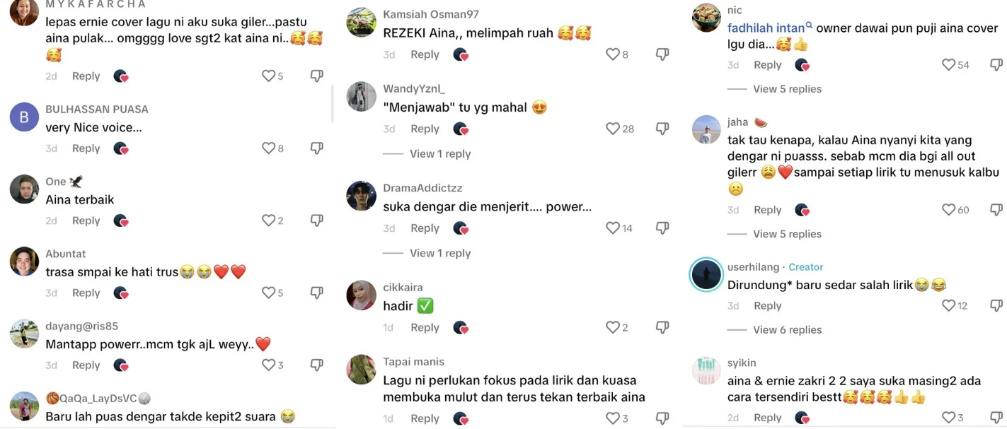 “Tak tau kenapa, kalau Aina Abdul nyanyi, kita yang dengar ni puasss, sebab dia bagi all out gilerrr. Sampai lirik tu menusuk kalbu”