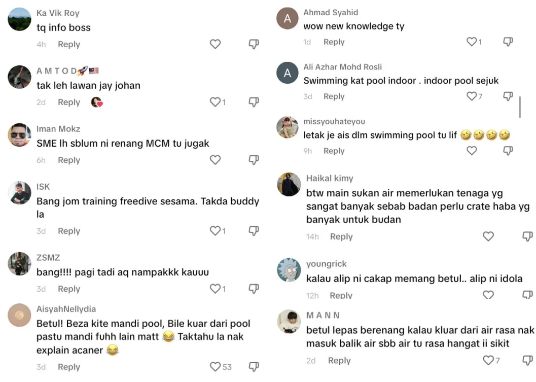 Rata-rata netizen komen mengenai mereka juga baru mengetahui hal tersebut. Dan ada juga yang pernah laluinya dan mengatakan suhu air berbeza ketika di dalam kolam renang dan air di luar kolam.