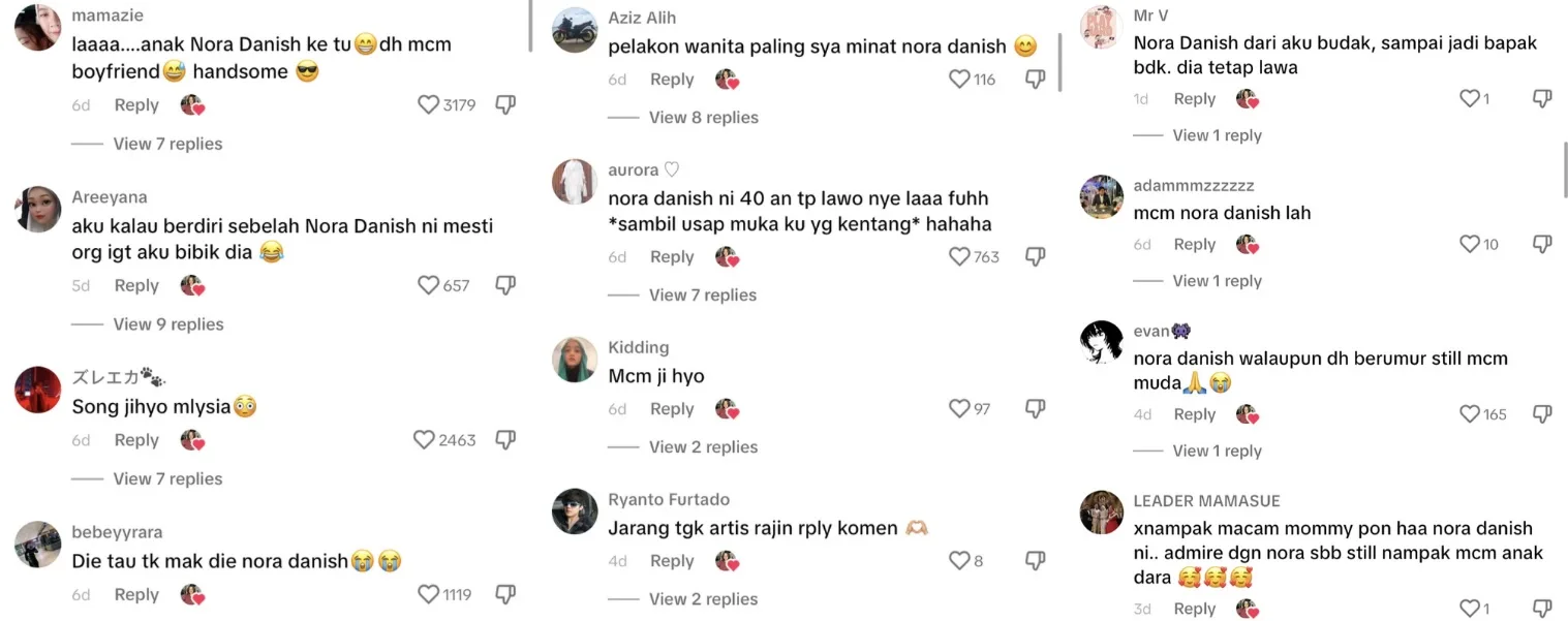 “Tak nampak macam mommy pun haa Nora Danish ni, admire dengan Nora Danish sebab still nampak macam anak dara”-kata mereka