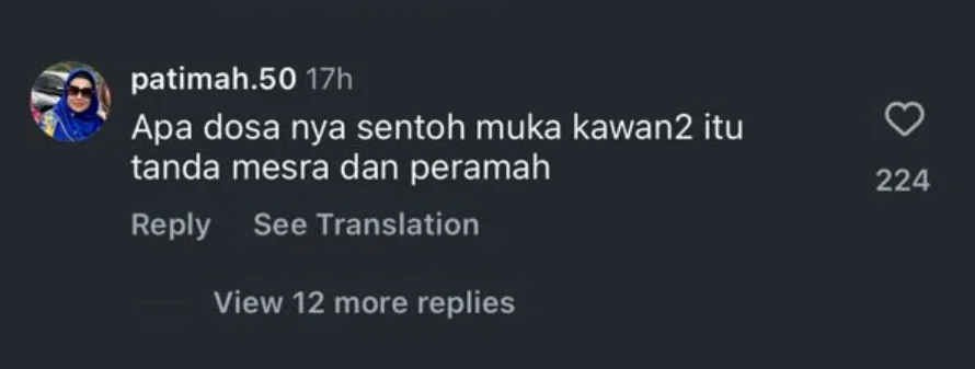 “@patimah.50 janganlah suka-suka sentuh muka orang. Tak semua orang juga. Semua masuk dalam adab juga. Sana nak nasihat, jangan marah ya”, tulis @am_17284.