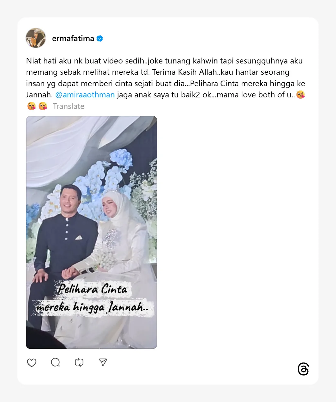 Amira Othman jaga anak saya tu baik-baik okay. Mama love both of you.”-tulis Erma di Thread