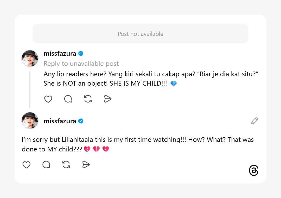 “Any lips reader here?. Yang kiri sekali tu cakap apa? ‘Biar je dia kat situ?’. Dia bukan objek! Dia anak saya!!.”-tegas Fazura di Thread