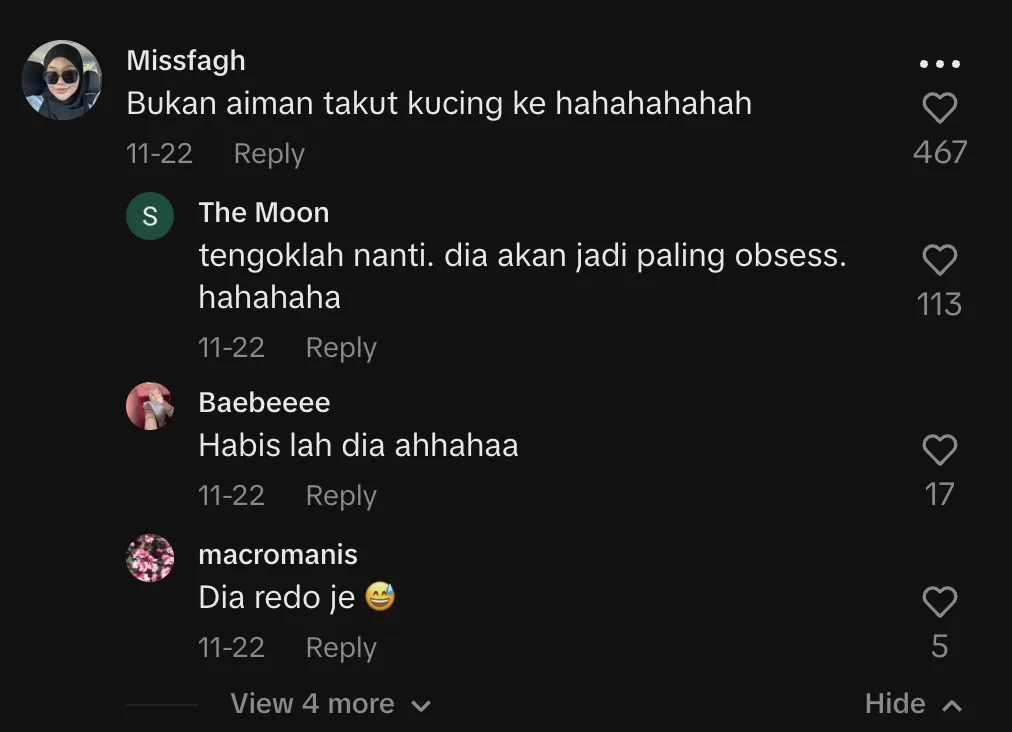Ada yang siap bergurau kononnya Aiman sebenarnya tak takut, cuma ‘buat-buat’ saja. Apa pun, yang pasti, dalam video itu Aiman nampak steady bermain dengan anak kucing tersebut, siap tunjuk gaya bapa mithali bagi anak-anak rasa selesa dan berani.