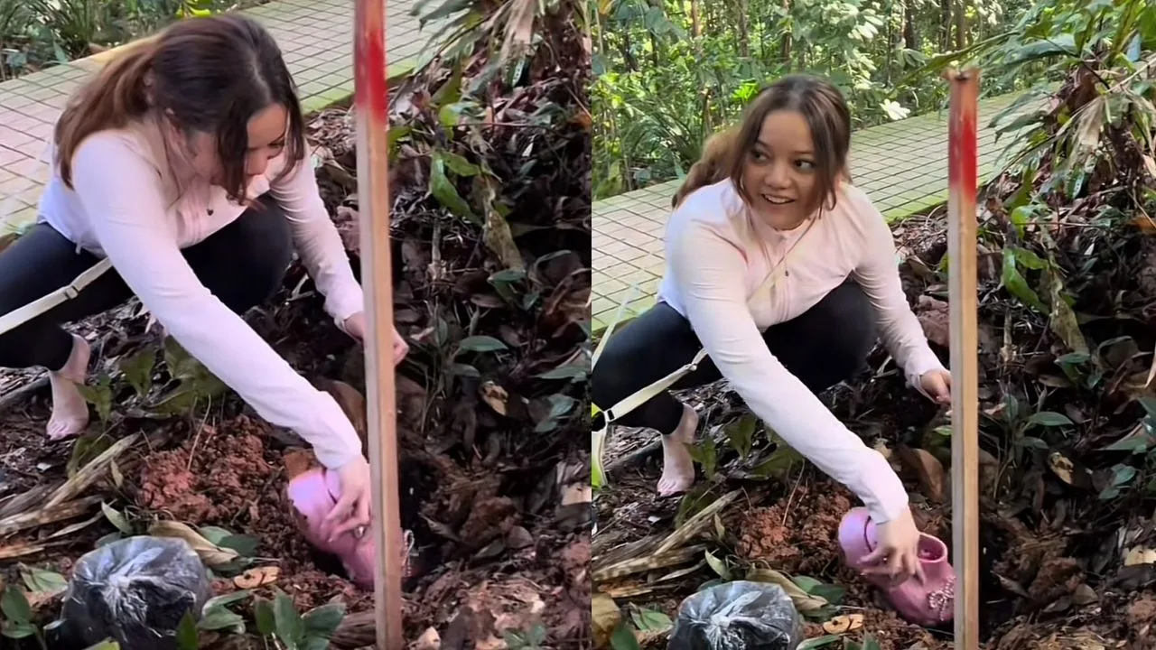 Di dalam video berkenaan, memaparkan Leona yang cuba menanam pokok dengan menggunakan kasut Crocs berwarna merah jambu miliknya itu. Tambahnya lagi, dia berjaya menanam sebanyak 5 pokok yang diberi nama li, lu, la lo, le.