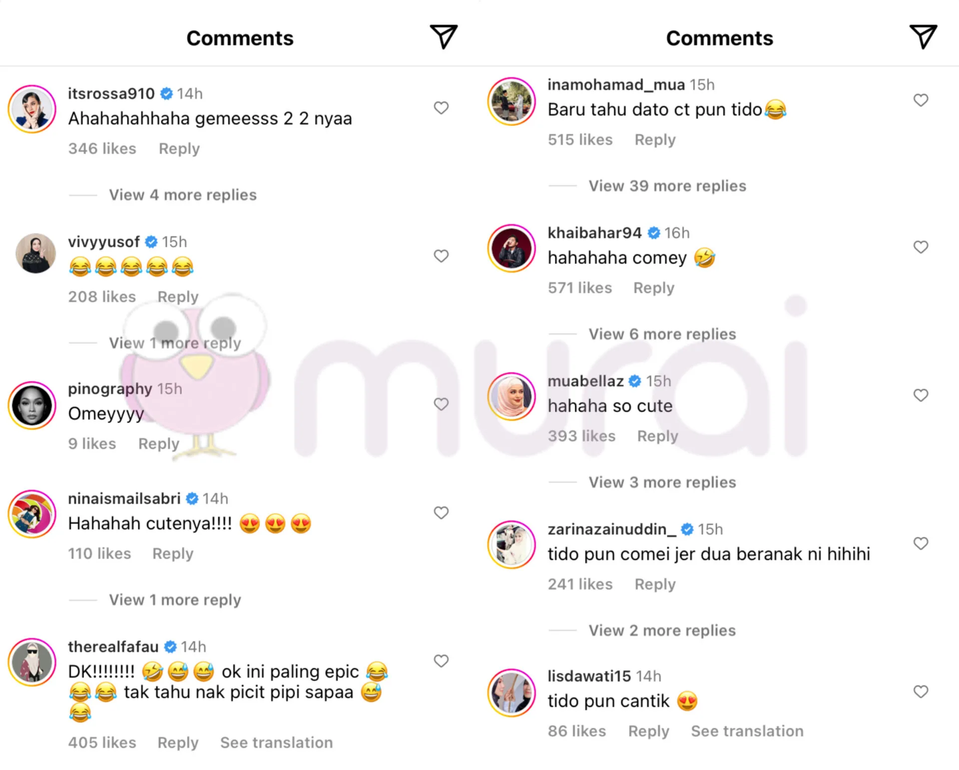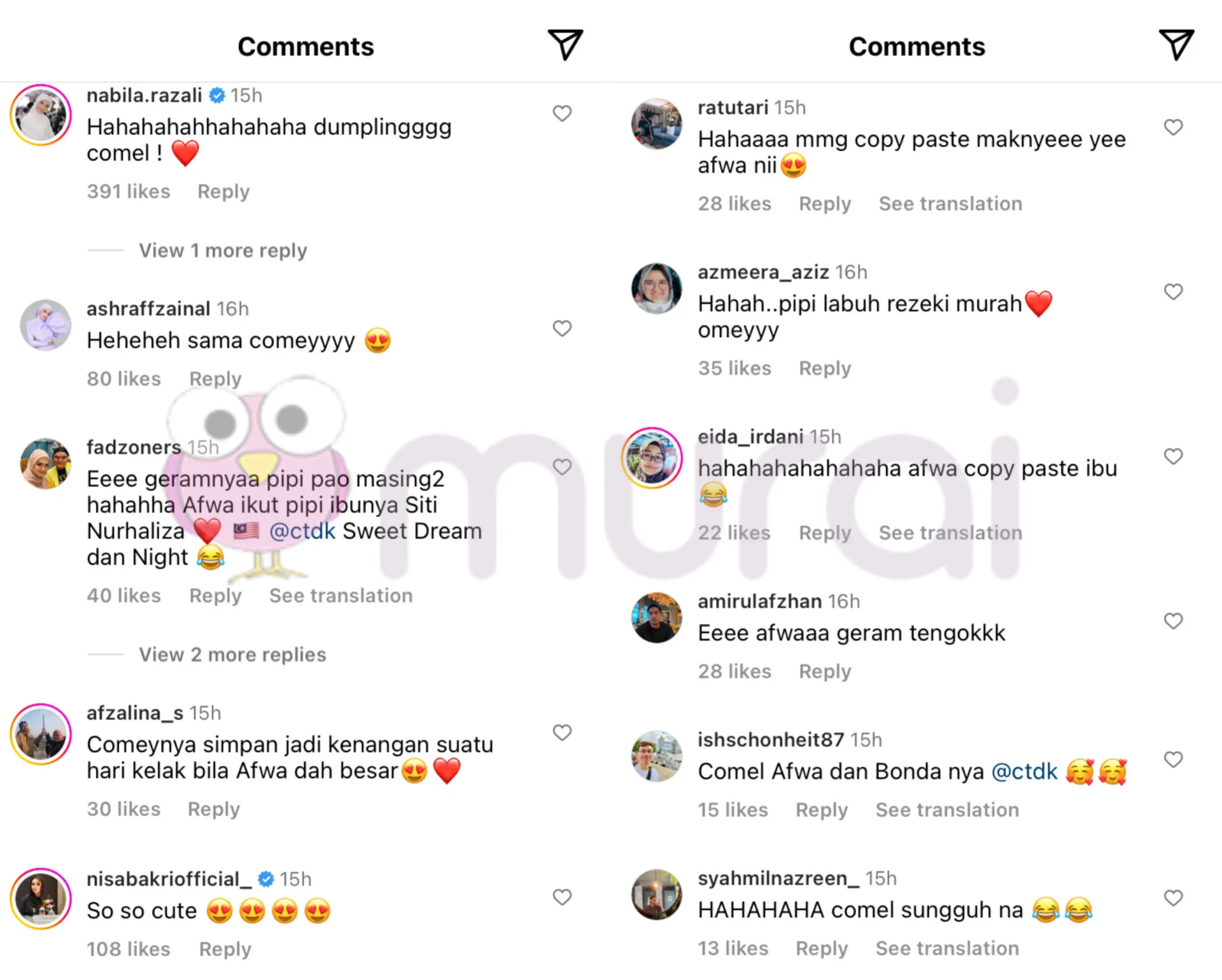 Di ruangan komen, rata-rata peminat serta rakan selebriti termasuklah penyanyi terkenal Indonesia, Datuk Rossa turut berkongsi rasa terhibur melihat gelagat si ibu dan anak yang sangat comel itu.