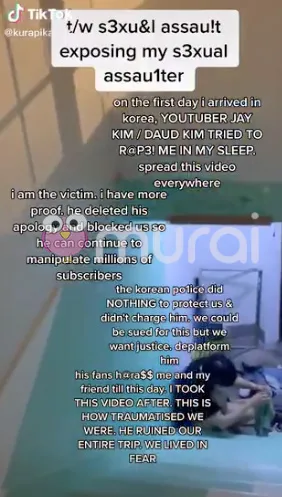 “Hari pertama saya tiba di Korea. Youtuber Daud Kim cuba merogol saya ketika saya tidur. Tolong sebarkan video ini. Saya telah menjadi mangsa, saya ada banyak bukti. Dia telah memohon maaf dan block saya, jadi dia boleh memanipulasi jutaan subscribernya di Youtube.”- tulisnya di video tersebut.
