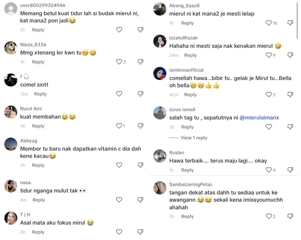 Rata-rata netizen terhibur melihat Hawa dan Bella mengusik Mierul Aiman, serta mereka mengatakan bahawa Mierul Aiman sentiasa tidur di mana-mana.