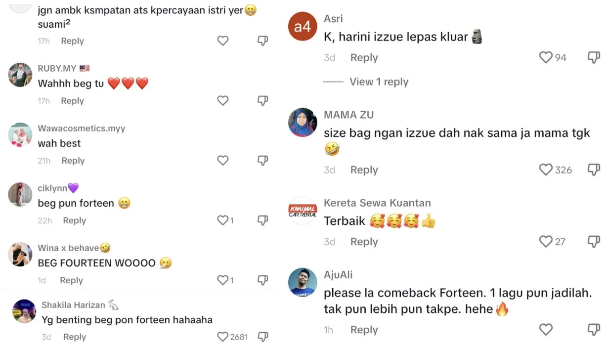 Rata-rata netizen teruja apabila melihat jenama beg golf yang dibawa oleh izzue Islam itu. Mereka berkata beg tersebut sama dengan kumpulannya dahulu Forteen. Mereka juga mengatakan bahawa merindui serta meminta agar kumpulan tersebut keluarkan satu lagu untuk peminatnya.