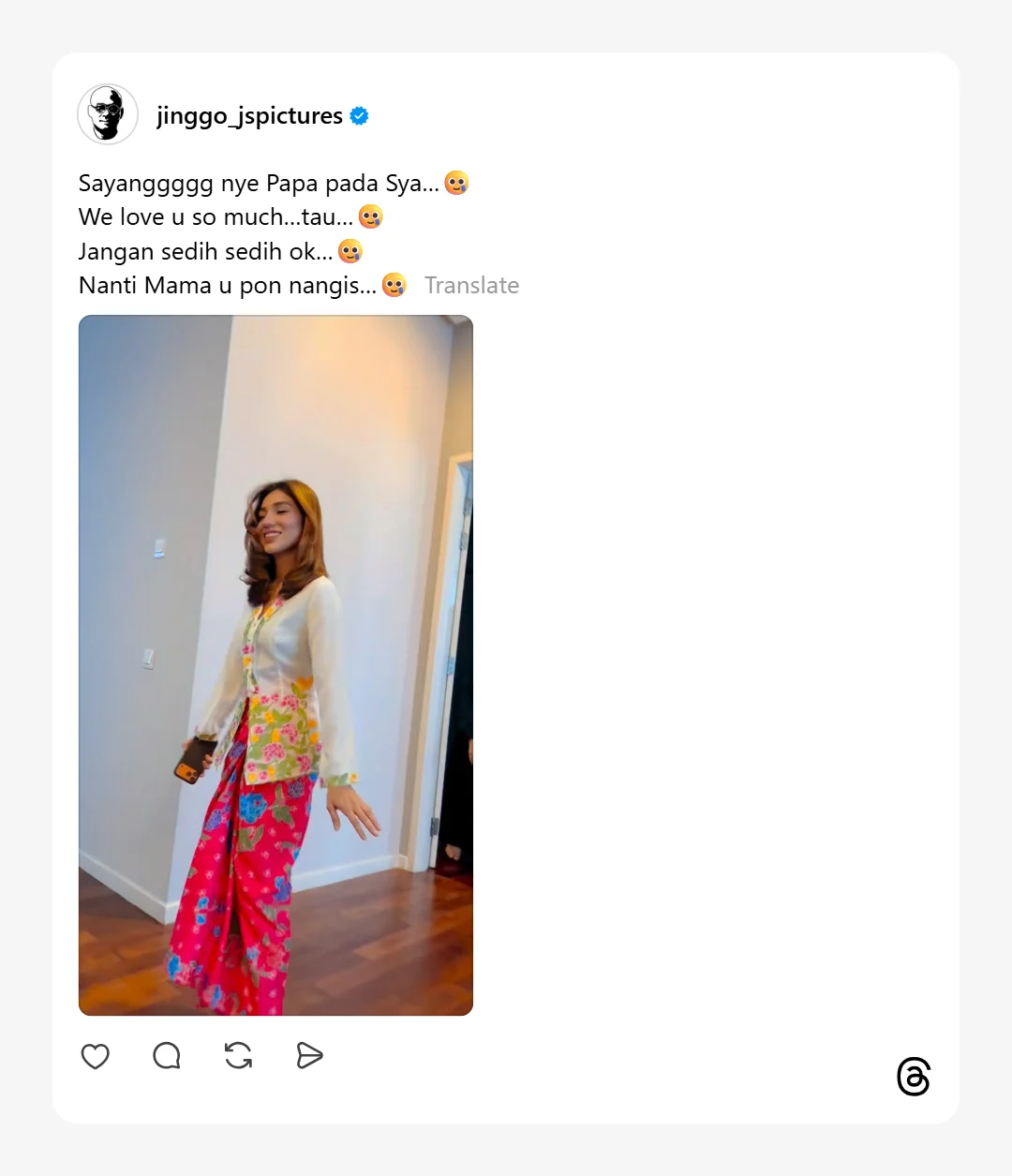 “Sayangnya papa pada Sya. We love you so much tau. Jangan sedih-sedih okay. Nanti mama you pun nangis.”-tulis Jinggo di Thread