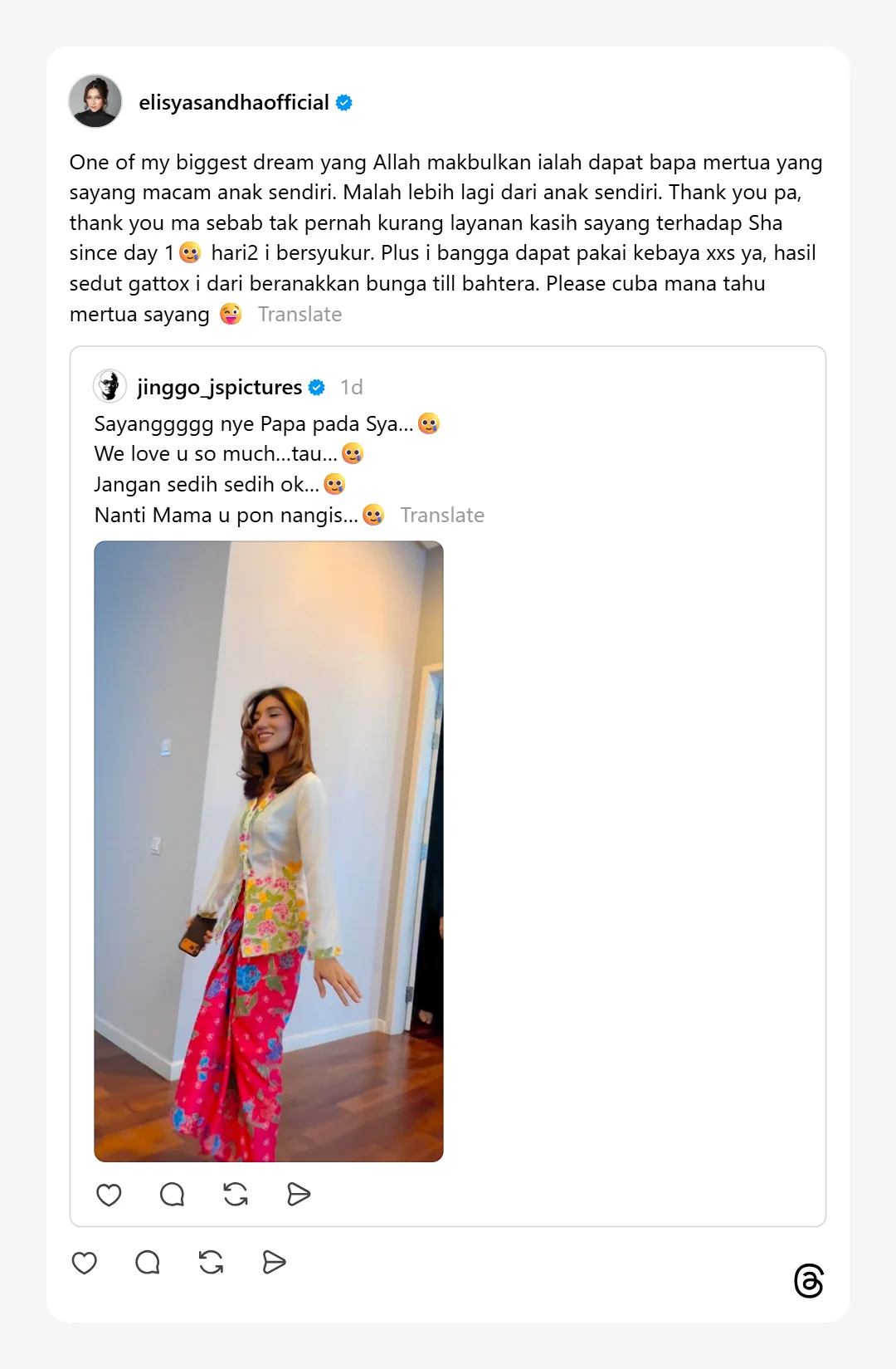 Thank you pa, thank you ma sebab tak pernah kurang layanan kasih sayang terhadap Sha sejak hari pertama. Hari-hari saya bersyukur.”-tulis Elisya di Thread