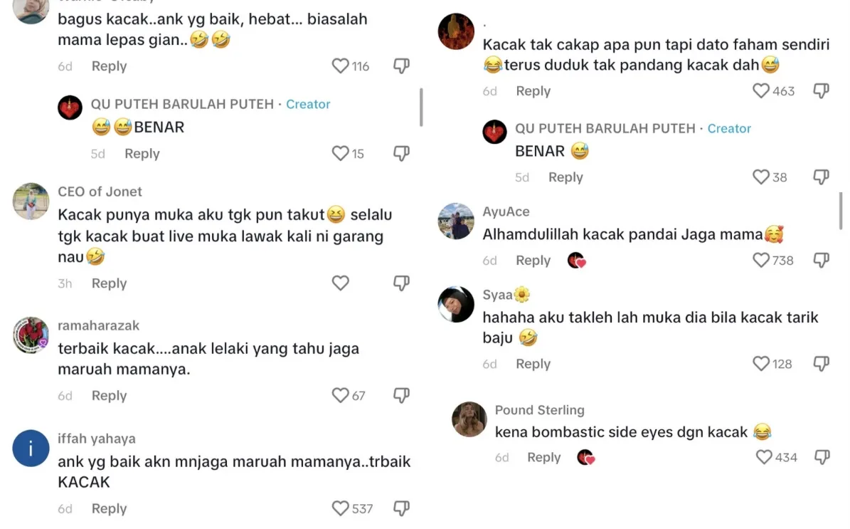 Rata-rata netizen kagum dengan tindakan Kacak itu kerana tidak membiarkan pakaian ibunya yang melekat pada bahagian pinggul itu.