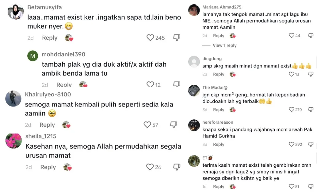 Namun, kelihatan keadaan Mamat Exists yang semakin kurus itu membuatkan peminat sayu melihatnya. Mereka juga turut mendoakan Mamat Exist agar semakin sihat dan kembali menghiburkan peminat-peminatnya.