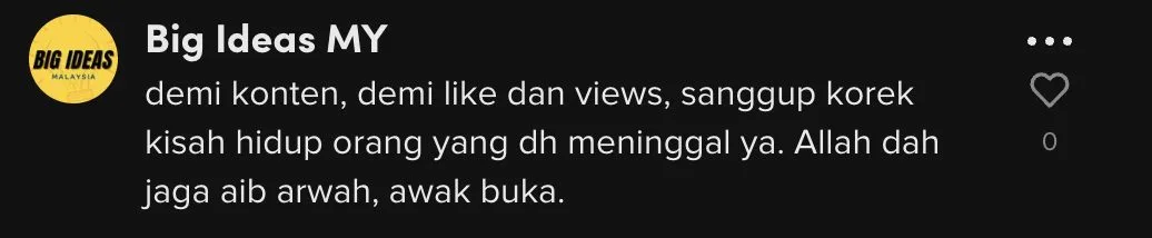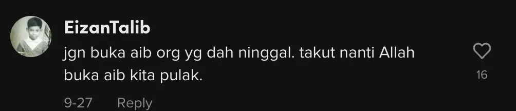Dalam pada itu, ada di kalangan netizen yang tak bersetuju pemilik akaun ini berkongsi dan mendedahkan aib orang lain, lebih-lebih lagi kepada seseorang yang sudah meninggal dunia.