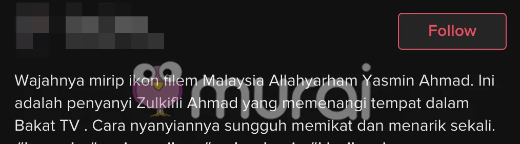 “Wajahnya mirip ikon filem Malaysia Allahyarham Yasmin Ahmad. Ini adalah penyanyi Zulkifli Ahmad yang memenangi tempat dalam Bakat TV . Cara nyanyiannya sungguh memikat dan menarik sekali”- tulisnya akaun TIkTok ini.