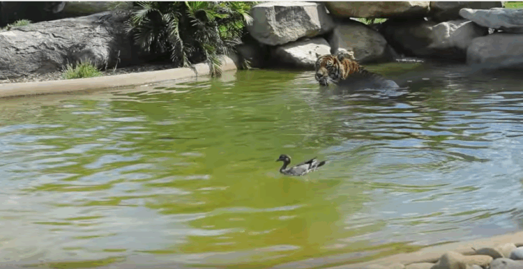 Dalam klip video ini menunjukkan itik tersebut berenang di sekitar dalam kolam di sebuah kandang harimau besar di Symbio Wildlife Park di Australia.