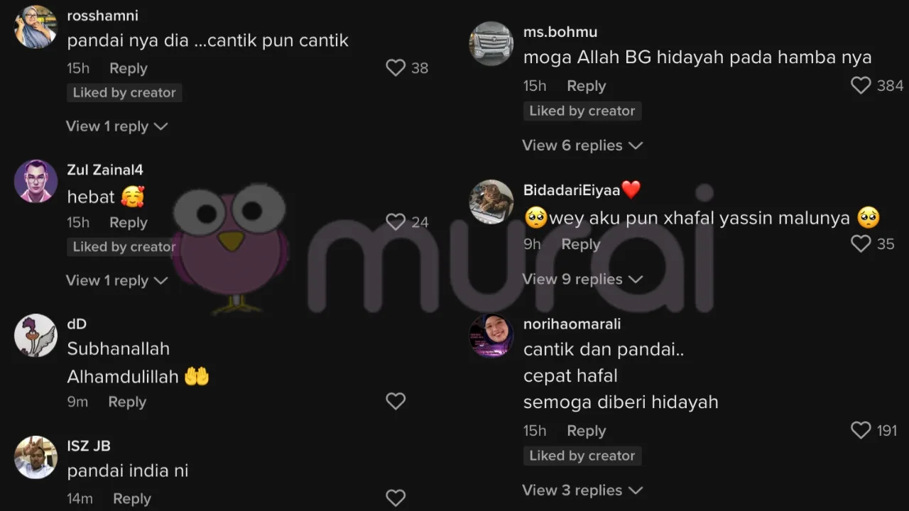 Di ruangan komen video tersebut juga turut meriah dengan komen yang positif dari netizen. Rata-rata mereka memuji Divya kerana hafal dan pandai membaca surah-surah di dalam Al-Quran.