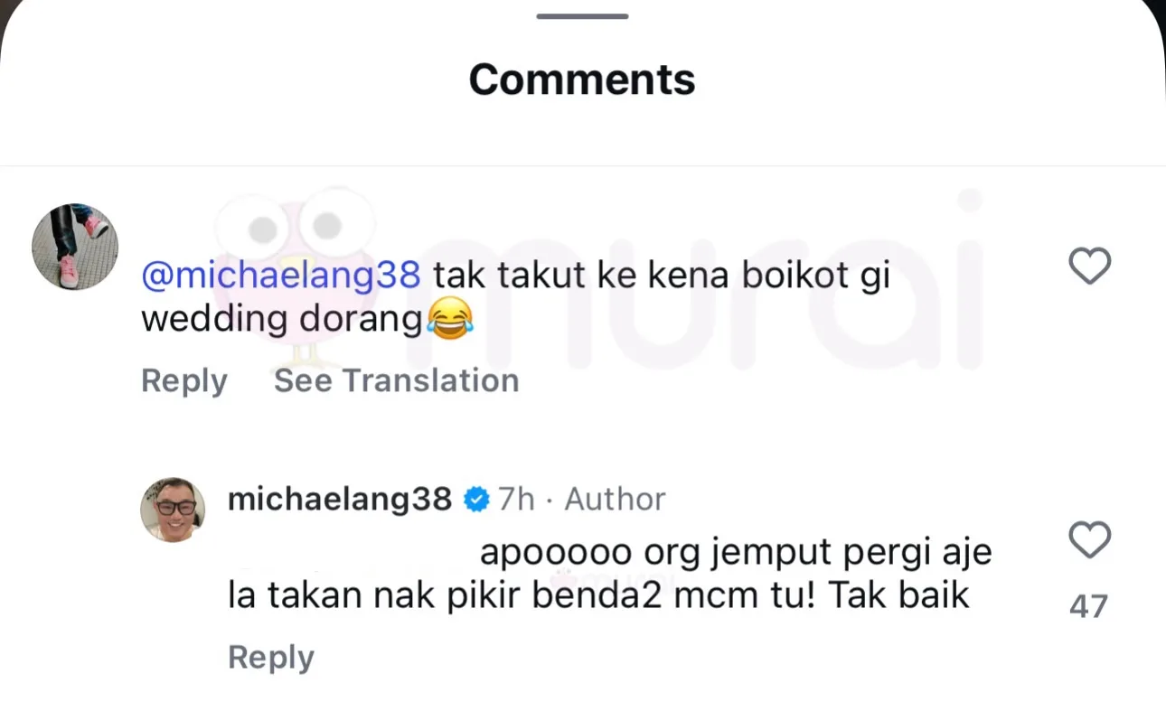Tidak berdiam diri, Michael dilihat membalas komen salah seorang netizen dengan menjelaskan bahawa dia telah dijemput untuk menghadiri majlis resepsi mereka selain menegur sikap netizen terlibat sebagai ‘tak baik’