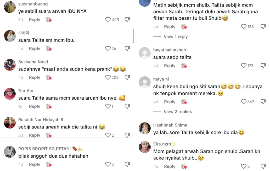 Namun, apa yang menjadi perhatian ramai mengenai video tersebut adalah mereka mengatakan bahawa suara Talita seakan-akan suara ibu mereka Allahyarhamah Siti Sarah. Mereka juga mengungkapkan bahawa melihat Telatah Talita dan Matin menginggatkan mereka dengan telatah Allahyarhamah Siti Sarah Dengan Shuib.