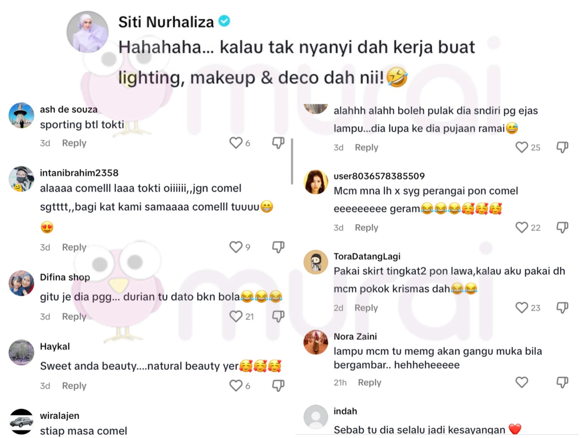 “Hahahaha.. kalau tak nyanyi dah, kerja buat lighting, makeup dan deco dah nii”-tulis Siti