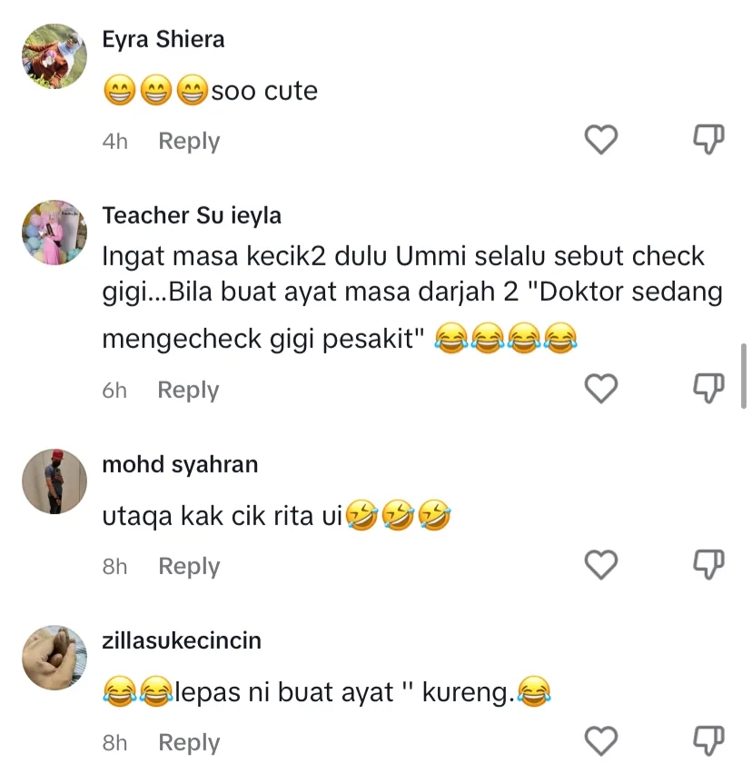 “Ingat masa kecik-kecik dulu, Ummi selalu sebut check gigi, bila buat ayat masa darjah 2 “Doktor sedang mengecheck gigi pesakit”-kata mereka