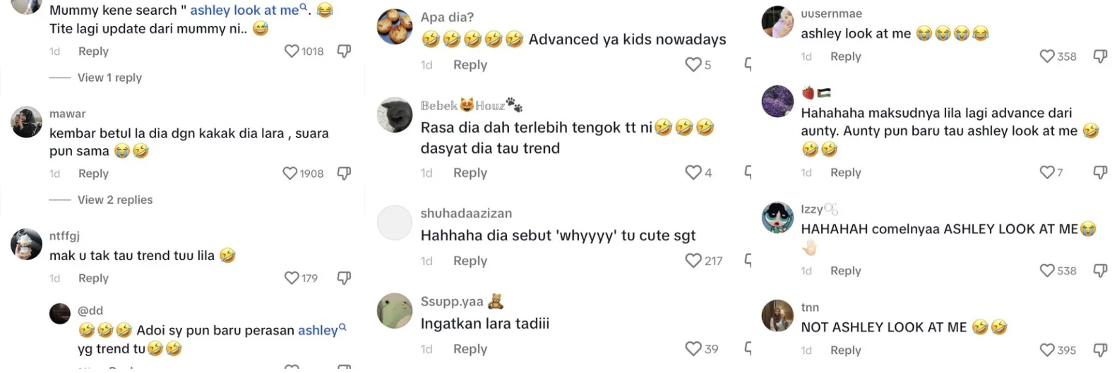 Rata-rata netizen terhibur melihat Scha yang tidak tahu apa yang disebut oleh anaknya. ‘Ashley looked at me‘ merupakan trend yang sedang berkeliaran ditiktok. Mereka juga mengatakan bahawa Lyla lagi update mengenai trend dari Scha sendiri.