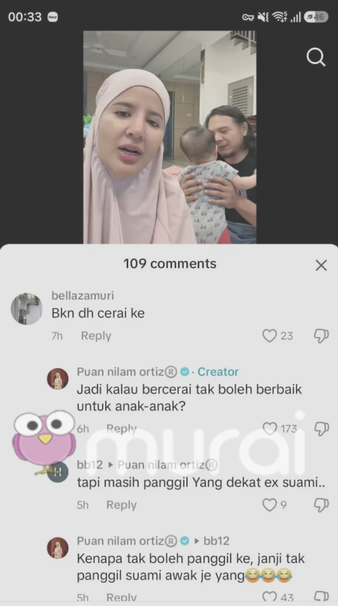 Di ruangan komen, ada yang tampil dengan persoalan, “Bukan dah bercerai ke? seolah-olah mempertikaikan tindakan Nur Nilam. Namun, respon Nur Nilam cukup tenang tetapi tegas. Katanya, “Jadi kalau bercerai tak boleh berbaik-baik demi anak?”