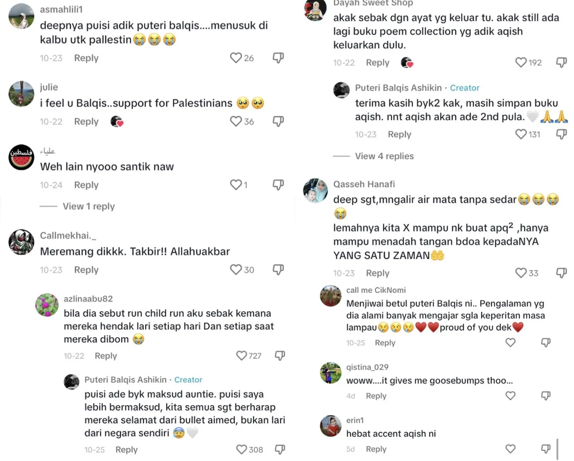 Rata-rata netizen sebak mendengar puisi dari Puteri Balqis yang menusuk kalbu itu. Tidak lupa juga, mereka memuji bahawa sememangnya dia pandai menulis puisi yang sangat puitis beserta maksud yang mendalam.