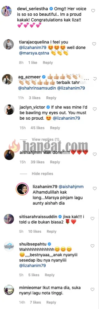 Menerusi perkongsian itu, Liza begitu berbangga dengan kebolehan anaknya yang mewarisi bakat seni suara sama sepertinya. Lebih manis, Marsya yang menyanyikan lagu Tiada Lagi Tangisan dendangan Aishah turut menjuarai pertandingan nyanyian tersebut.