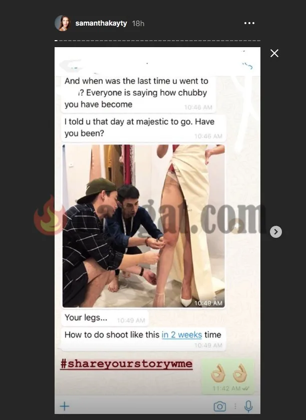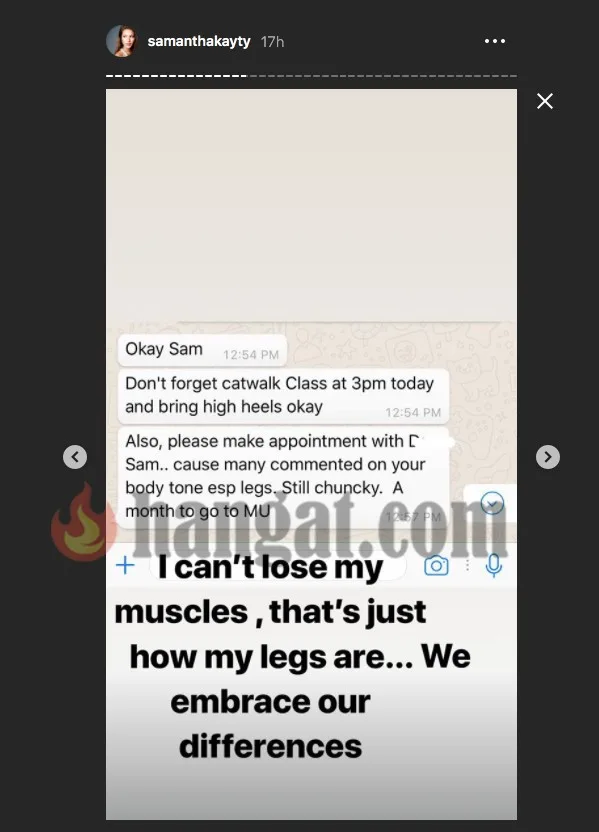 Bagi Samantha, semua itu didedahkannya kerana netizen perlu tahu mengenai apakah yang terjadi disebaliknya dan tidak perlu dirahsiakan kerana semua orang tidak perlu takut menceritakan pengalaman mereka. Tegasnya lagi, setiap orang memiliki bentuk badan berbeza termasuklah dirinya sendiri.