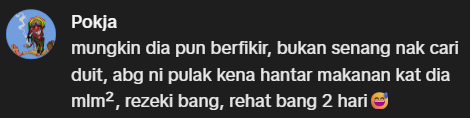 “Mungkin dia pun berfikir, bukan senang nak cari duit, abg ni pulak kena hantar makanan kat dia malam-malam. Rezeki bang, rehat bang 2 hari.”