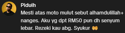 “Mesti atas motor mulut sebut alhamdulillah dan menangis. Aku yang dapat RM50 pun dah senyum lebar. Rezeki kau abang. Syukur.”