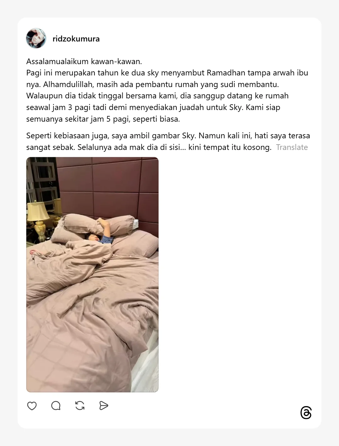 Kongsi Ridzokumura atau nama sebenarnya Abd Ridzuan Abdul Mutalib menerusi hantaran di Threads, menyatakan bahawa tahun ini merupakan tahun kedua anak lelakinya itu menyambut Ramadhan tanpa arwah ibunya selain menitipkan rasa syukur terhadap pembantu rumah yang sanggup datang ke rumah untuk menyediakan juadah sahur seawal jam 3.00 pagi.