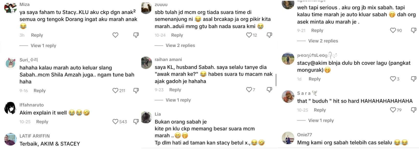 Rata-rata diruangan komen juga mereka mengatakan perkara yang sama seperti Stacy, hanya bercakap loghat Sabah bila tengah marah dan nada loghat Sabah selalunya tinggi-tinggi.