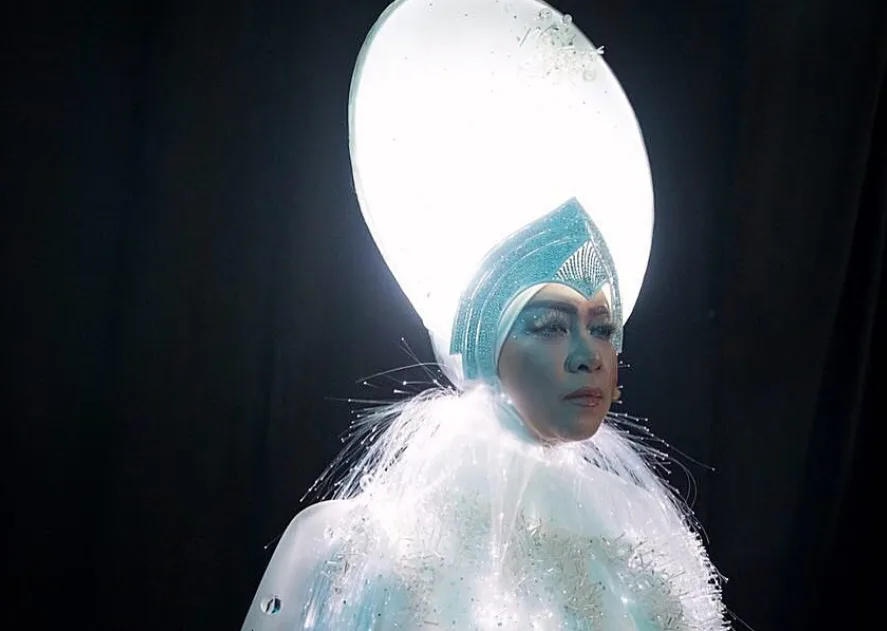 Menarik bukan? Pakaian begitu menakjubkan seolah-olah tubuh Melly mengeluarkan cahaya ini kerana ia diperbuat daripada kain yang ditenun dengan lampu LED. [murai.my]