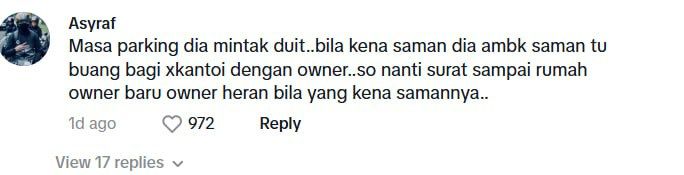 “Masa parking, dia minta duit. Bila kereta kena saman, dia ambil dan buang saman itu supaya tak kantoi dengan owner. Nanti bila surat saman sampai rumah, barulah owner pelik bila sebenarnya kereta dia kena saman.” Ujar netizen lain di ruangan komen.